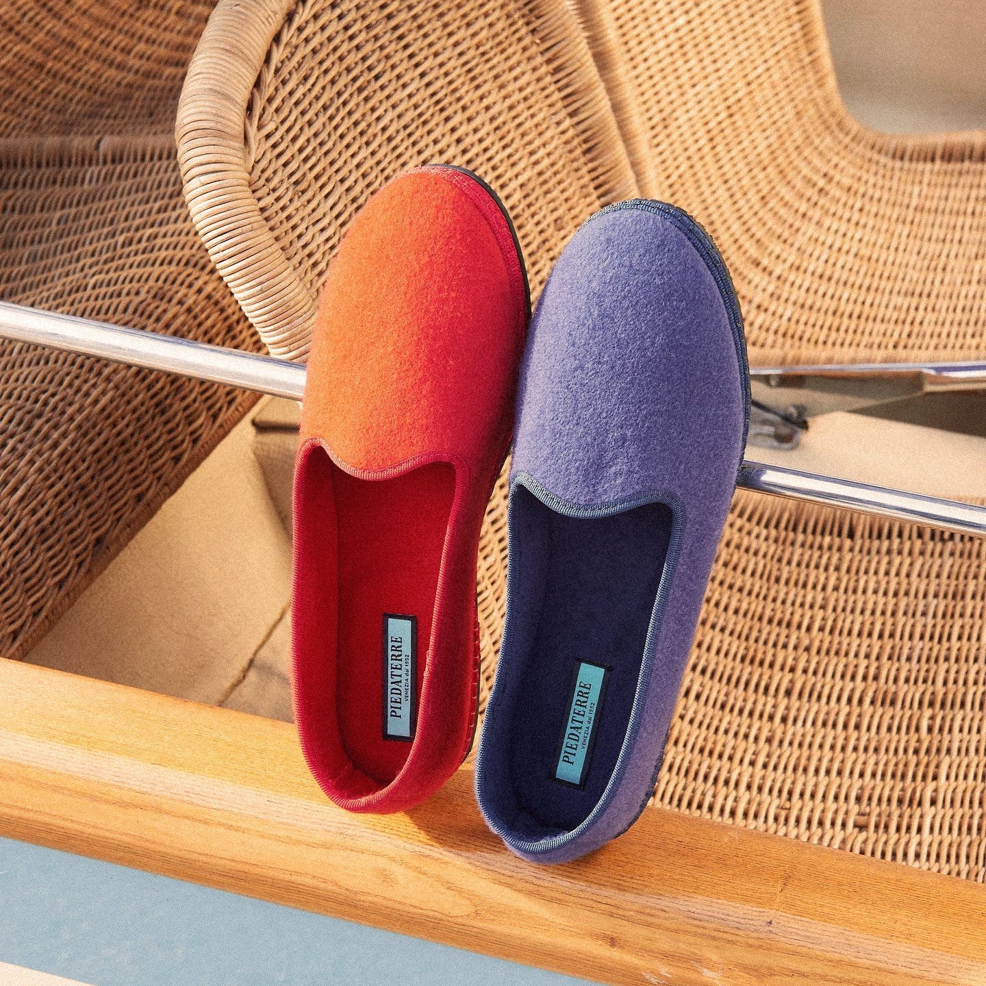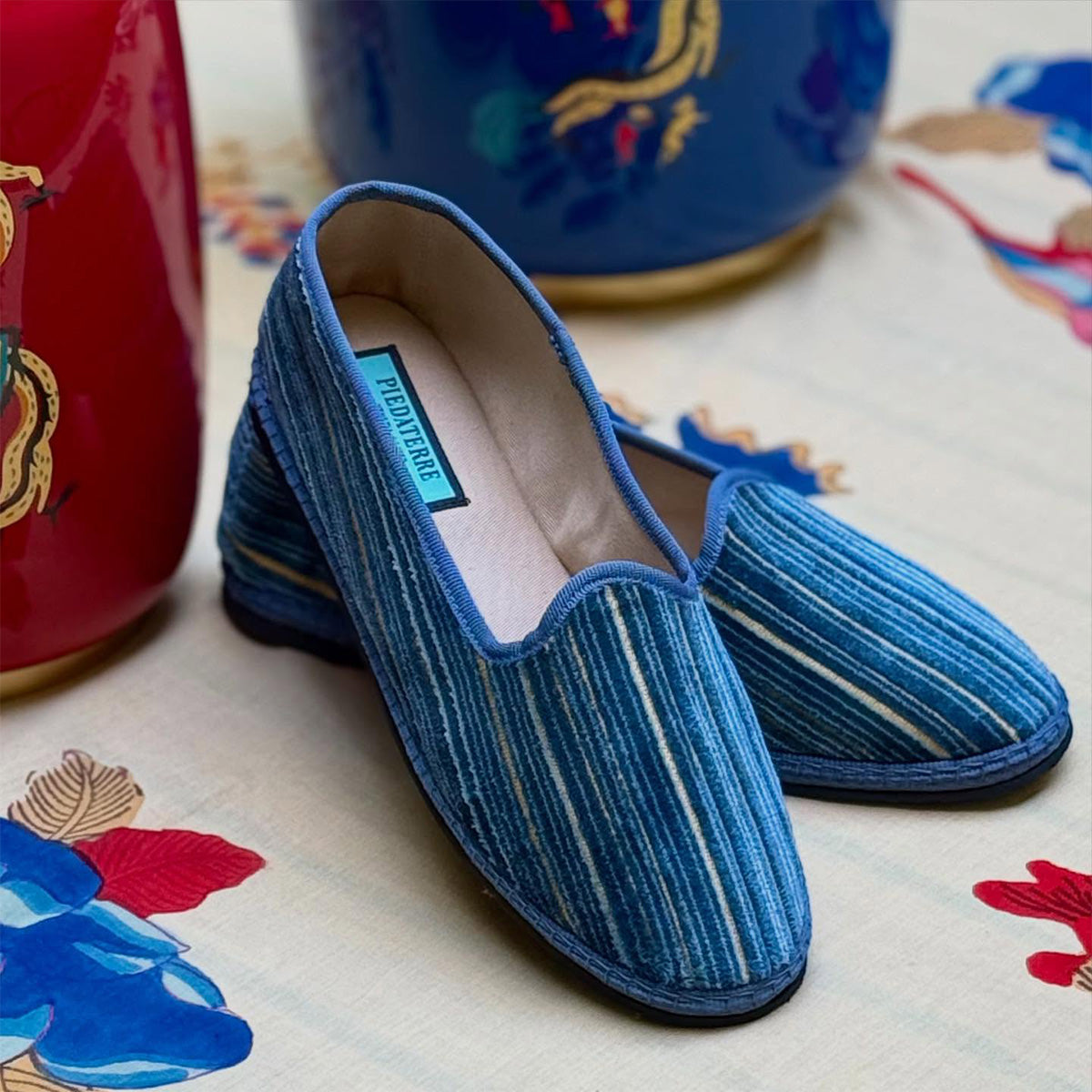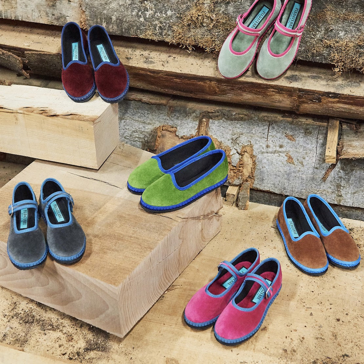 Le friulane Piedàterre sono realizzate con diversi tessuti naturali (principalmente il velluto di cotone) prodotti internamente con palette di colori esclusive.