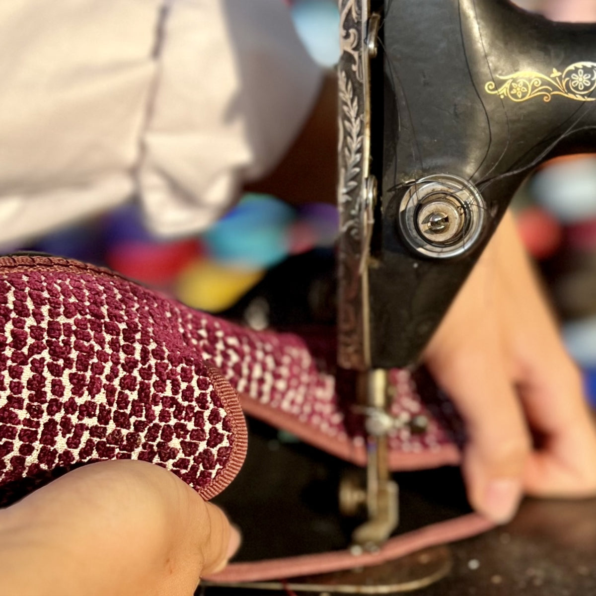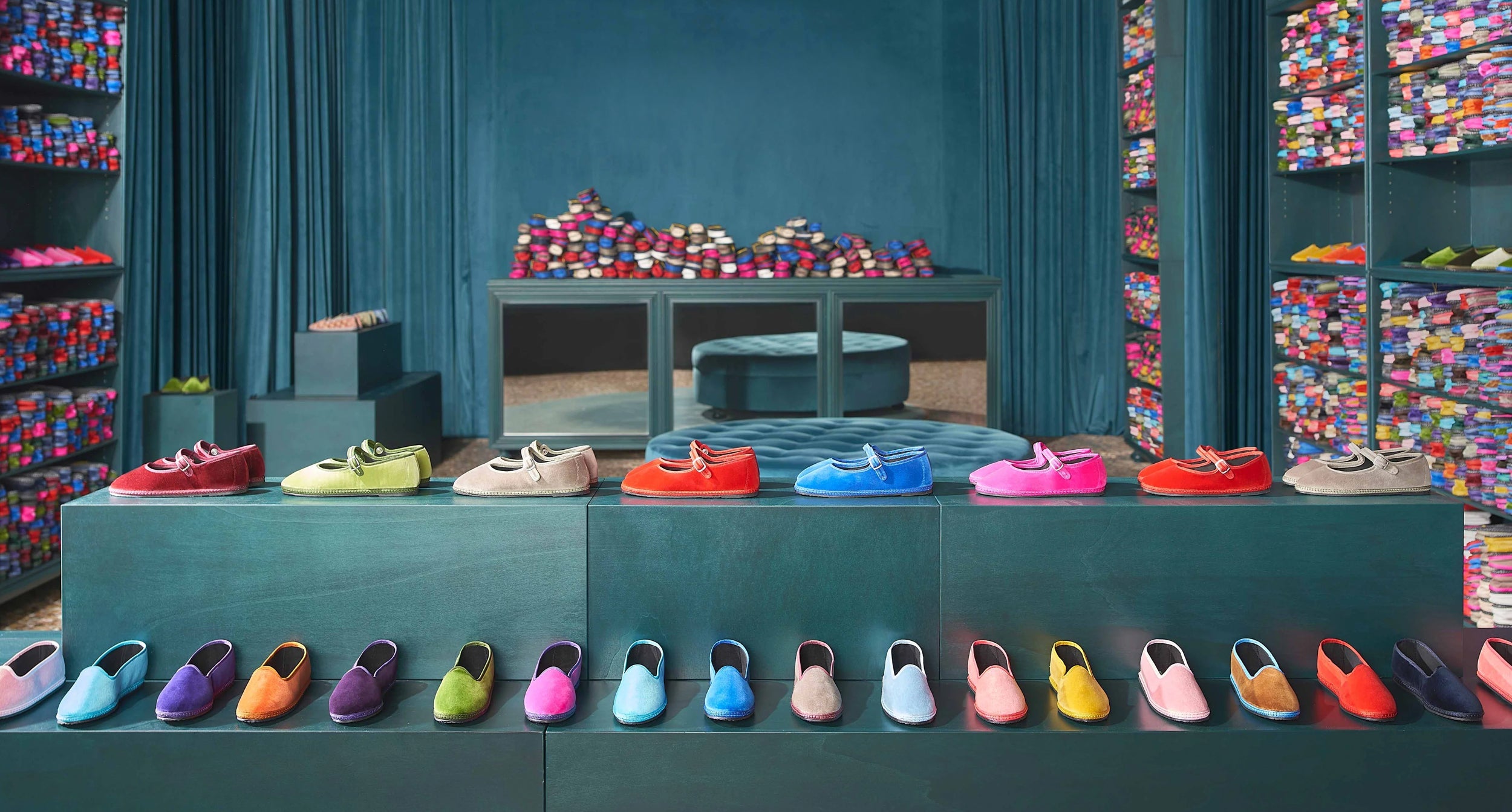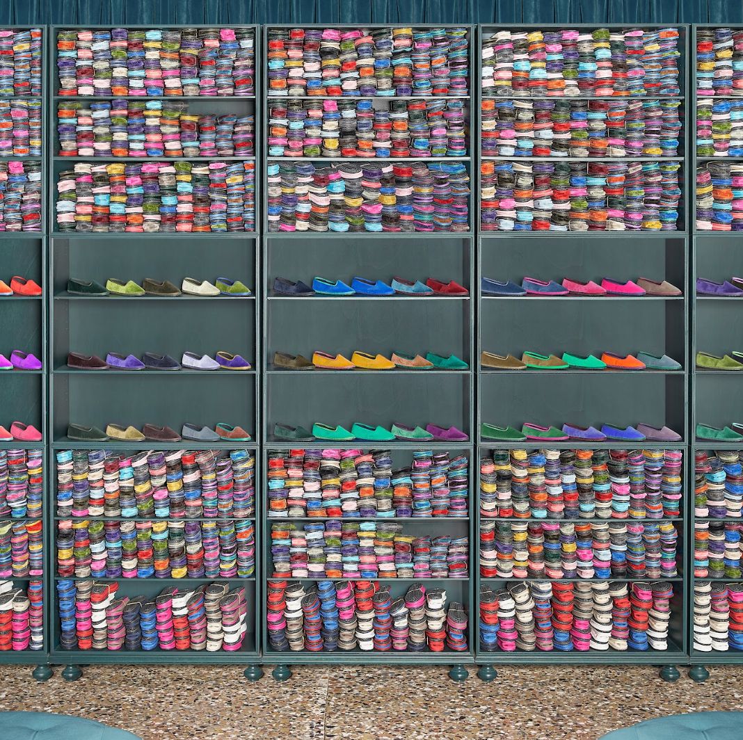Le friulane Piedàterre sono realizzate con diversi tessuti naturali (principalmente il velluto di cotone) prodotti internamente con palette di colori esclusive.